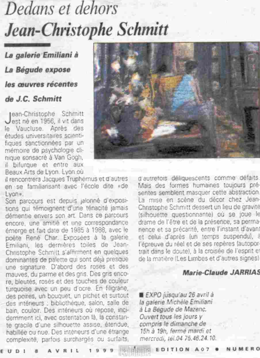 L'oeuvre de Jean-Christophe Schmitt, discrète et profonde, douce et sensiblement violente, j'ai la joie toujours renouvelée d'en prendre une plus exacte mesure à chaque visite de son atelier.